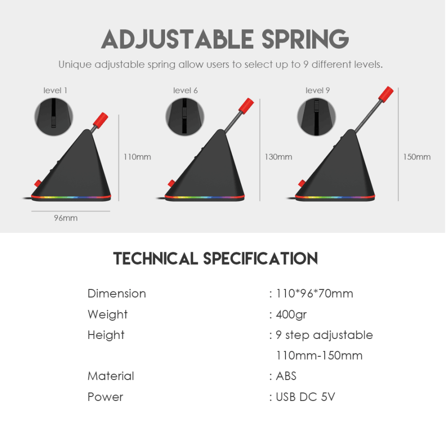 בנוסף, ניתן להתאים את גובה המתקן בצורה נוחה עם 9 דרגות כיוון (בין 110 מ"מ ל־150 מ"מ), כך שתוכלו להתאים אותו בדיוק לצרכים שלכם ולסוג העכבר.